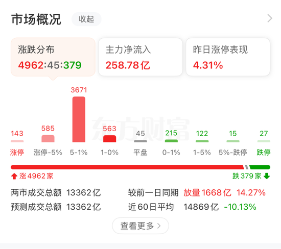 截至收盘,沪指涨1.13%,收报3316.11点;深证成指涨1.84%,收报10082.34点;创业板指涨1.97%,收报1986.41点。沪深两市成交额达到13362亿元,较上个交易日放量1668亿元。