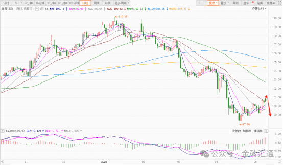 美元指数从100.15的低点一路上涨到110.18的次高点后,再次开启承压回落的走势。目前整体价格跌破并运行在MA250下方,并且跌破100的整数关口,呈明显的空头趋势。日内短线行情则建议看空震荡回落的走势。
